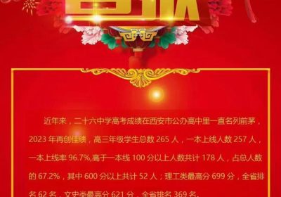 近年来,西安市第二十六中学高考成绩在西安市公办高中里一直名列前茅,2023年再创佳绩,高三年级学生总数265人,一本上线人数257人,一本上线率 96.7%,高于一本线100分以上…