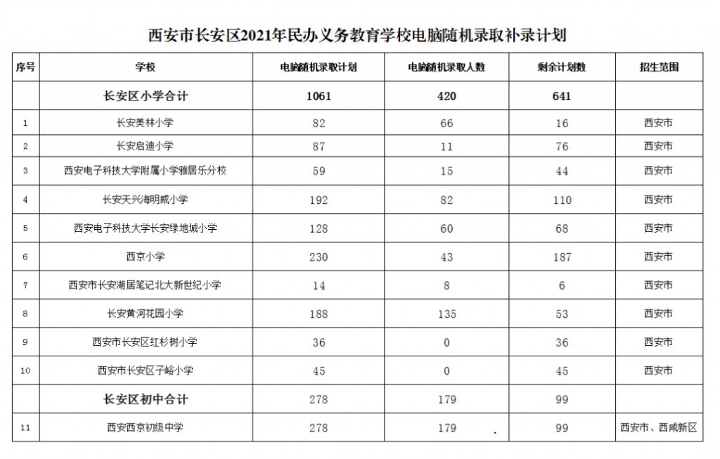 按照《西安市教育局关于做好2021年义务教育学校招生入学工作的通知》(市教发〔2021〕60号)要求,现将西安市长安区2021年民办义务教育学校电脑随机录取补录计划予以公布。