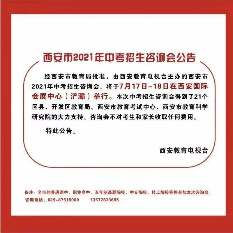 7月17日至7月18日,由西安教育电视台举办的2021年西安市中招咨询会在西安国际会展中心展览馆(西安市浐灞生态区会展一路1399号)举办,欢迎广大考生及家长前往咨询。