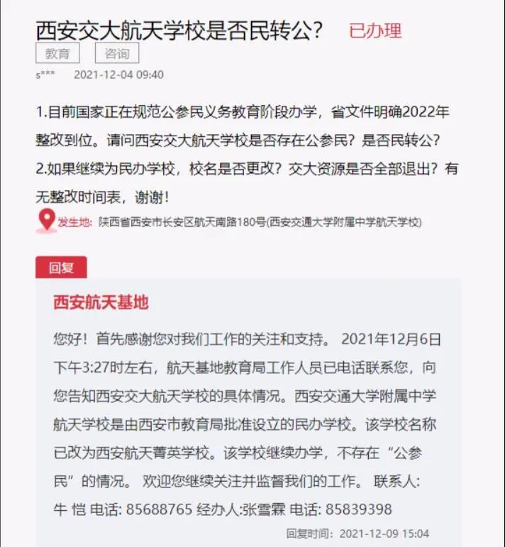 12月9日下午,航天基地官方回复,西安交通大学附属中学航天学校是由西安市教育局批准设立的民办学校。该学校名称已改为西安航天菁英学校。该学校继续办学,不存在“公参民”的情况。