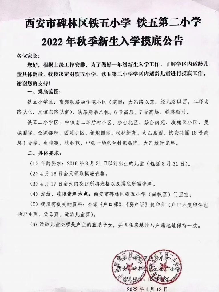 您好,根据上级工作安排,为了做好一年级新生入学工作,了解学区内适龄儿童具体数量,我校决定对铁五小学、铁五第二小学学区内适龄儿童进行摸底工作,谢谢您的支持!
