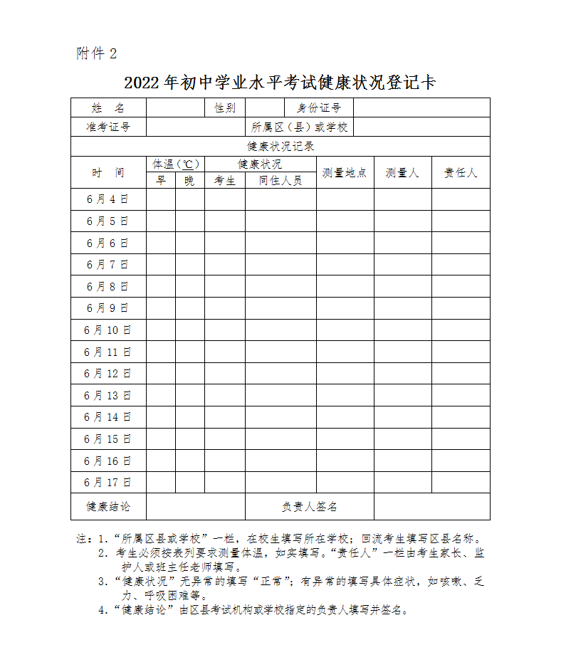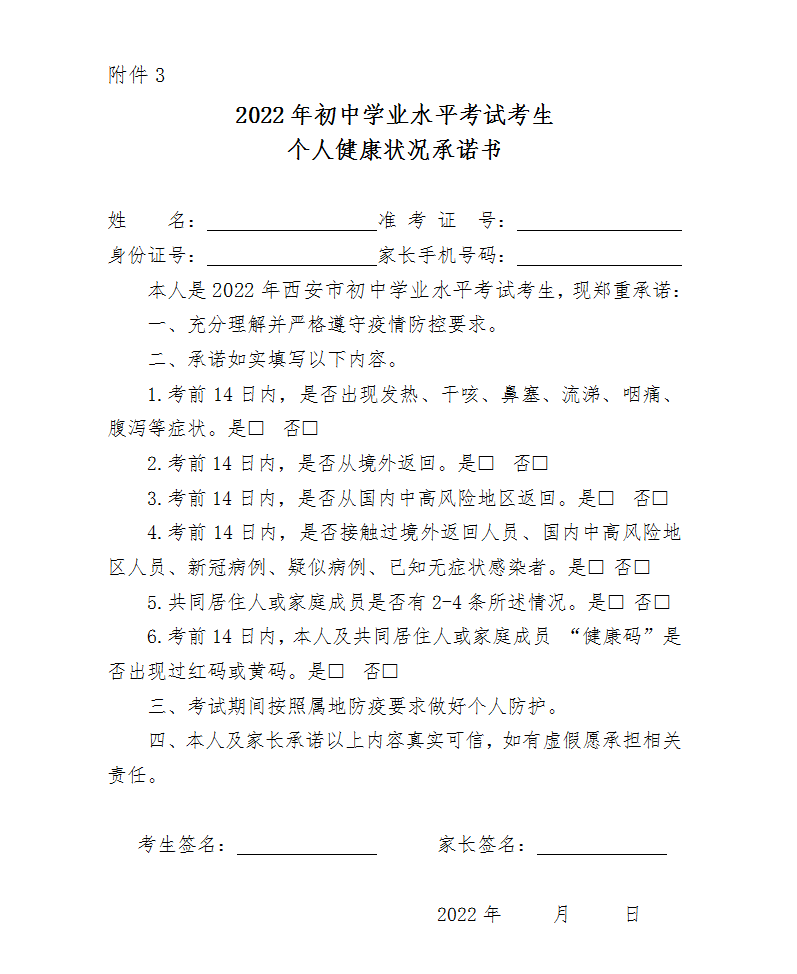 三、考生在初中学业水平考试前14天到初中学业水平考试结束应进入静态管理,坚持做到非必要不流动,不到人群流动性较大的场所活动,不接触有疫情风险的人员,做好每日体温测量、记录并进行健康状况监测,填写《2022年初中学业水平考试健康状况登记卡》(附件2)和《2022年初中学业水平考试考生个人健康状况承诺书》(附件3)。考生健康如出现异常状况应立即向初中学业水平考试报名地考试机构报告,不得谎报、瞒报。