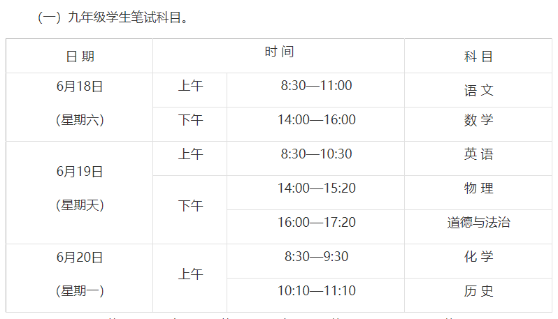(1)全省笔试科目:语文、数学、英语、物理、化学、道德与法治、历史,共7科7卷。各科目试卷满分值及考试时长分别为: