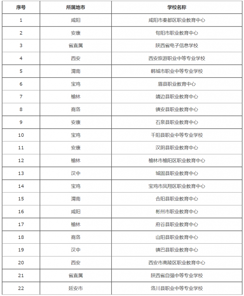 根据《陕西省高水平示范性中等职业学校建设三年行动计划(2018-2020年)》精神和要求,经各市及有关学校申报、专家评审,省教育厅认定咸阳市秦都区职业教育中心等22所学校(具体名单见附件)为陕西省高水平示范性中等职业学校。现就有关事项通知如下: