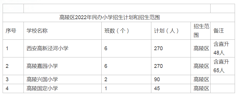 西安市高陵区2022年民办小学招生计划