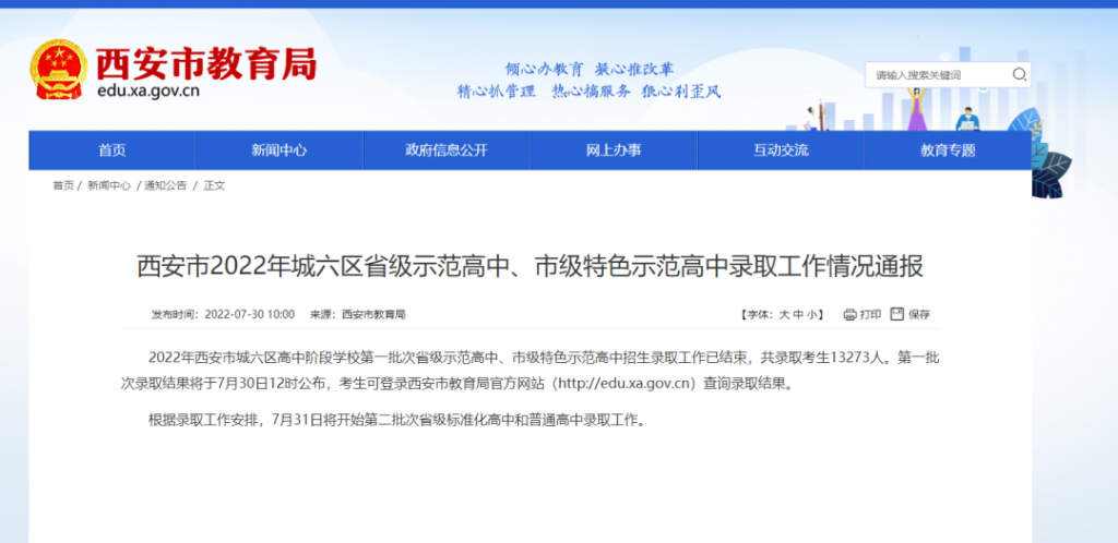 第一批次录取结果于7月30日12时公布,考生可登录西安市教育局官方网站(http://edu.xa.gov.cn)查询录取结果。