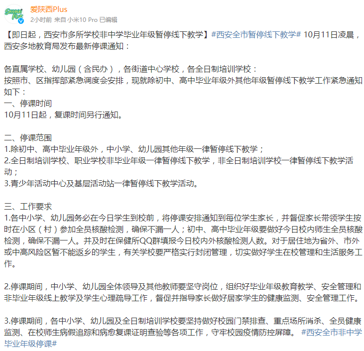 10月11日凌晨,西安多地教育局发布最新停课通知: