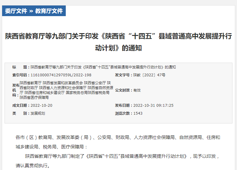 2021年底,教育部等九部门印发了《“十四五”县域普通高中发展提升行动计划》。近日,陕西省教育厅再次发文,规范普通高中招生,提升县中办学水平。