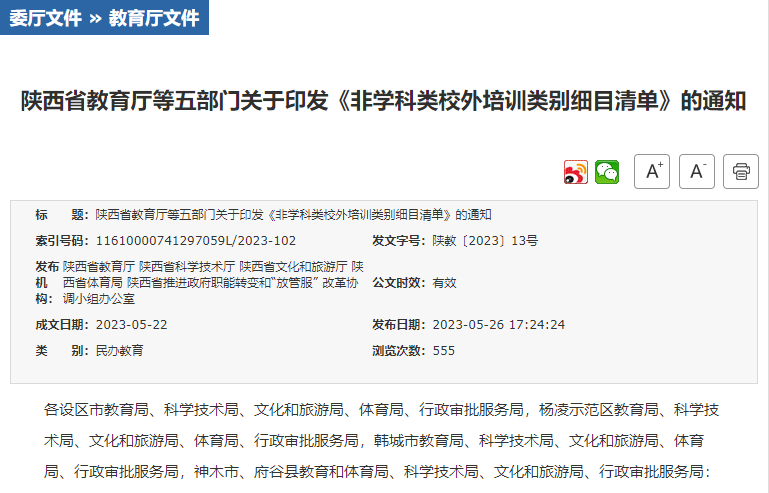 为深入贯彻落实《教育部等十三部门关于规范面向中小学生的非学科类校外培训的意见》,加强非学科类校外培训机构管理,省教育厅、省科技厅、省文旅厅、省体育局等部门联合制定了科技类、文化艺术类、体育类《陕西省非学科类校外培训类别细目清单》。现予以印发,请各地在非学科类校外培训机构审批(非学科类校外培训机构适用行政许可事项名称为“实施中等及以下学历教育、学前教育、自学考试助学及其他文化教育的学校设立、变更和终止审批”)、监管过程中抓好贯彻落实。尚未明确非学科类校外培训机构审批部门的地区,教育主管部门要充分发挥“双减”协调机制的作用,提请当地党委政府尽快依法依规划分审批职能。