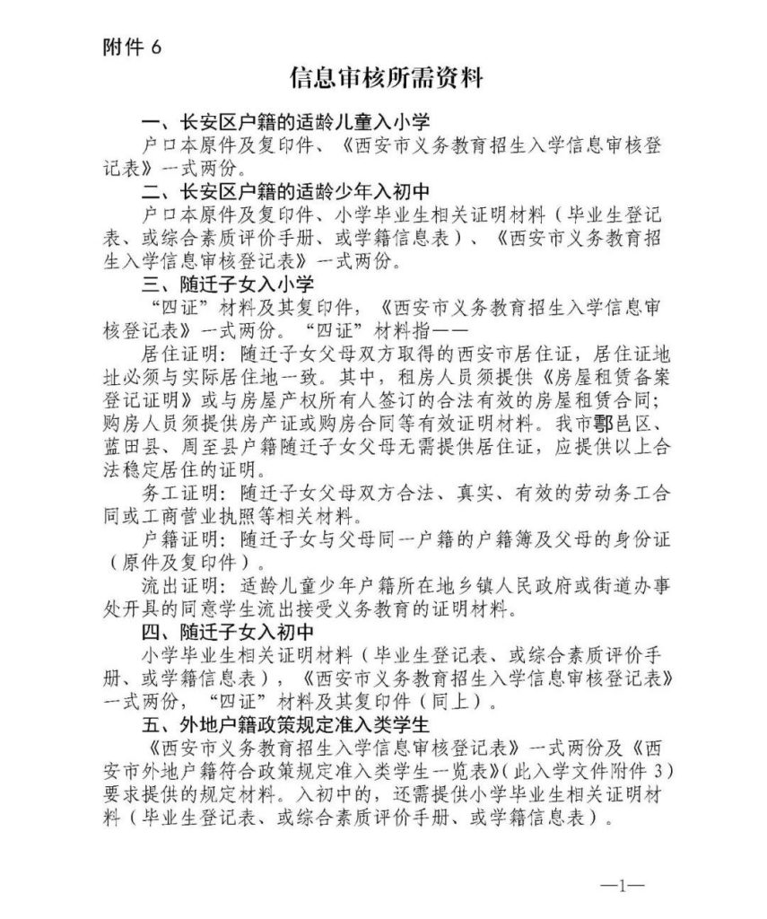 (1)学区内小区居民:户口本原件及复印件、出生证、房产证或购房合同、小学毕业生相关证明材料(毕业生登记表、或综合素质评价手册、或学籍信息表)、《西安市义务教育招生入学信息审核登记表》一式两份。