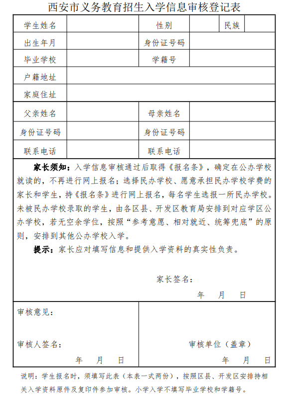 说明:学生报名时,须填写此表(本表一式两份),按照区县、开发区安排持相关入学资料原件及复印件参加审核。