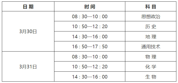 本次开考思想政治、历史、地理、通用技术、物理、化学、生物等7科,各科考试内容及形式将依据《陕西省普通高中学业水平考试说明》执行。考试时间安排如下: