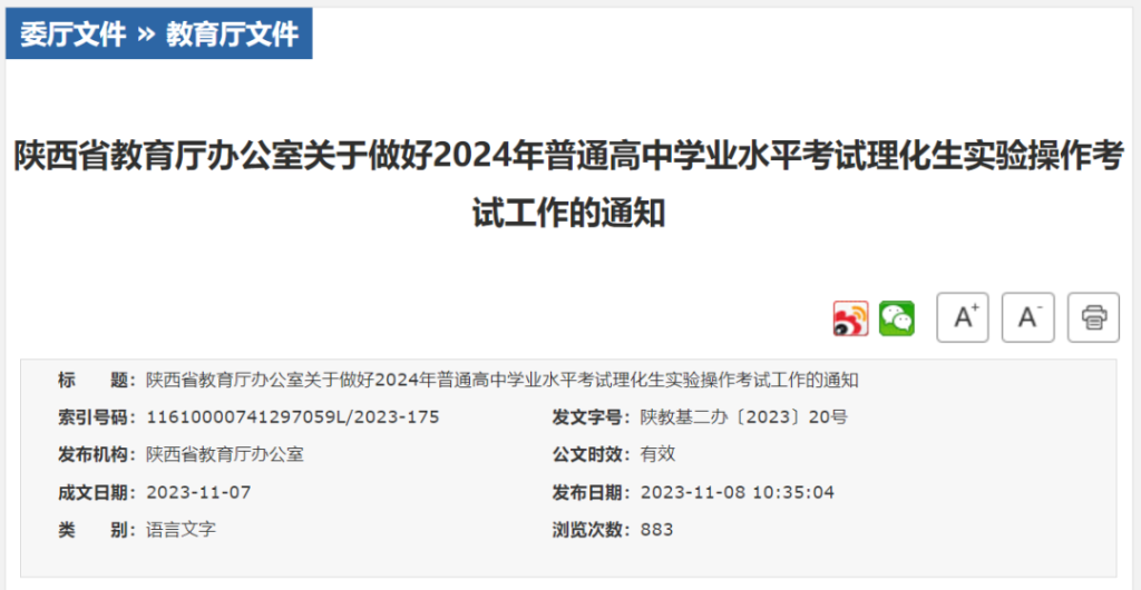 11月8日,陕西省教育厅发布关于做好2024年普通高中学业水平考试理化生实验操作考试工作的通知,具体内容如下。