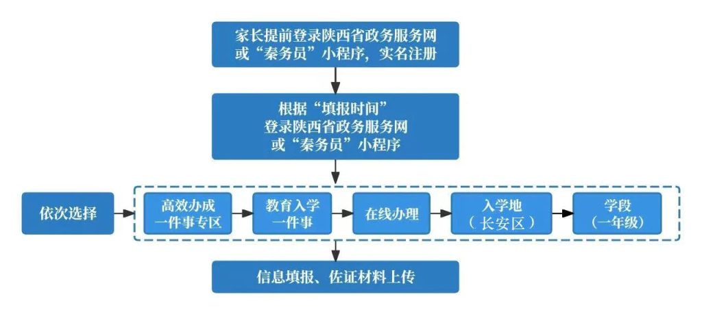 按照招生日程安排,在规定时间内,登录陕西省政务服务网或“秦务员”(省级),依次选择“高效办成一件事专区”→“教育入学一件事”→“在线办理”→“入学地”(长安区)→“学段”(一年级),按照指引完成入学信息填报和佐证材料上传,选择长安区第一小学或民办学校,如下图: