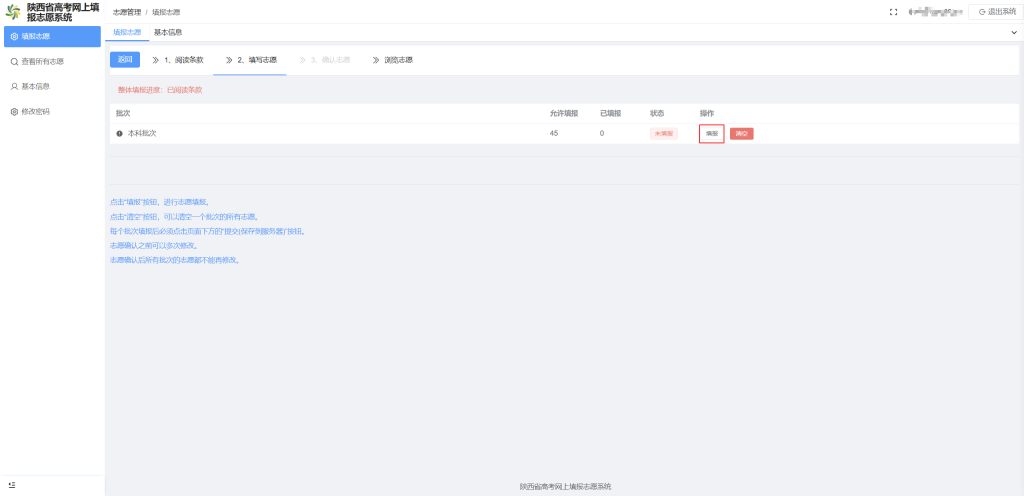 9.所有填报时间段内的批次和类型都完成填报并确认之后点击右上角的“退出系统”按钮,完成志愿填报。