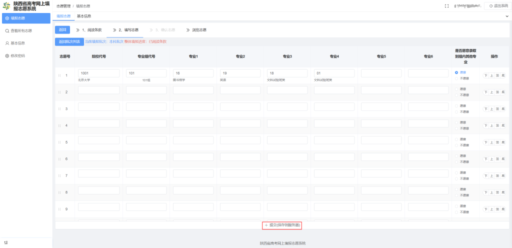 6.在“志愿填写列表中”根据自身情况依次填写志愿信息后,点击“提交(保存到服务器)”按钮进行志愿提交。