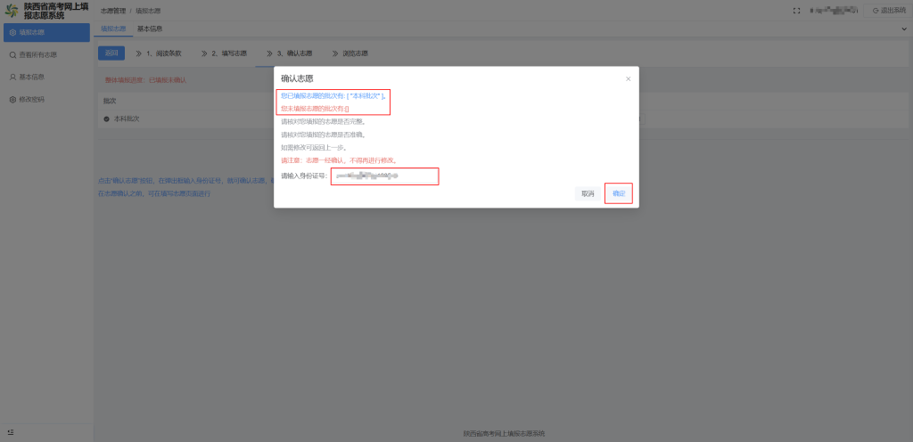 8.在弹出的页面框检查填报的批次无误后输入身份证号,点击“确定”按钮就可以完成确认,确认之后志愿就不得修改。