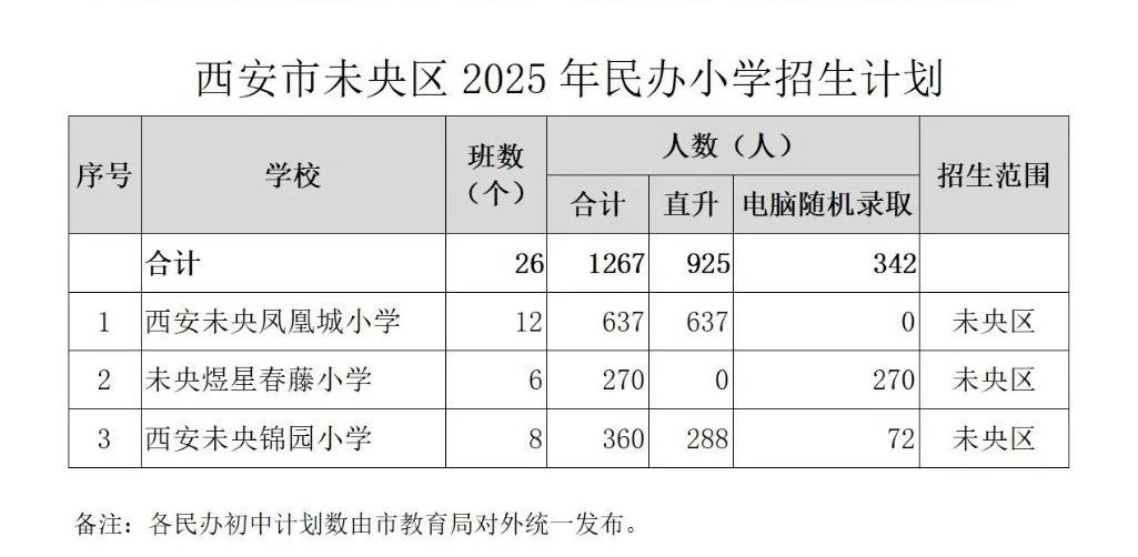 根据《西安市教育局关于做好2025年义务教育阳光招生工作的通知》(市教发〔2025〕66号)要求,经未央区教育局审定,现将2025年民办小学招生计划和招生范围公布如下。
