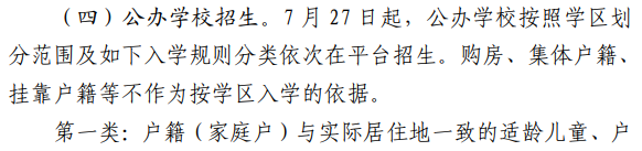 小学:先安排经开区内户房一致的适龄儿童入学,再依次统筹安排优抚类学生、其他经开区户籍类学生、其他符合政策规定准入类学生、随迁子女(有房有社保、有房无社保、无房有社保、无房无社保)入学。