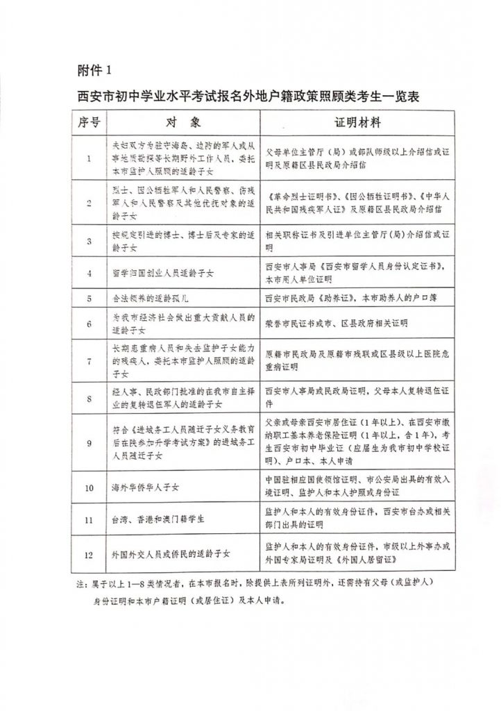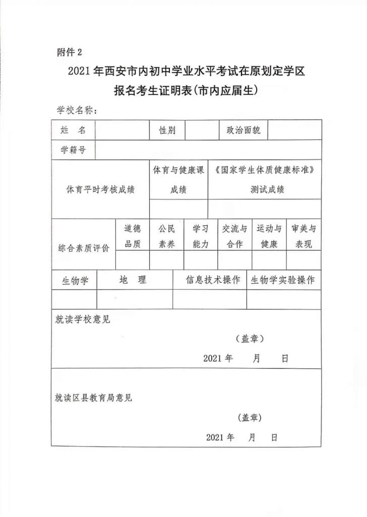 (2)在西安市内其它区县就读的我区户籍初中应届生,持户口本(卡)、身份证、《2021年西安市内初中学业水平考试在原划定学区报名考生证明表》(见附件2)到区教育考试中心进行资格审查,合格后到区教育考试中心指定报名学校办理报名手续;