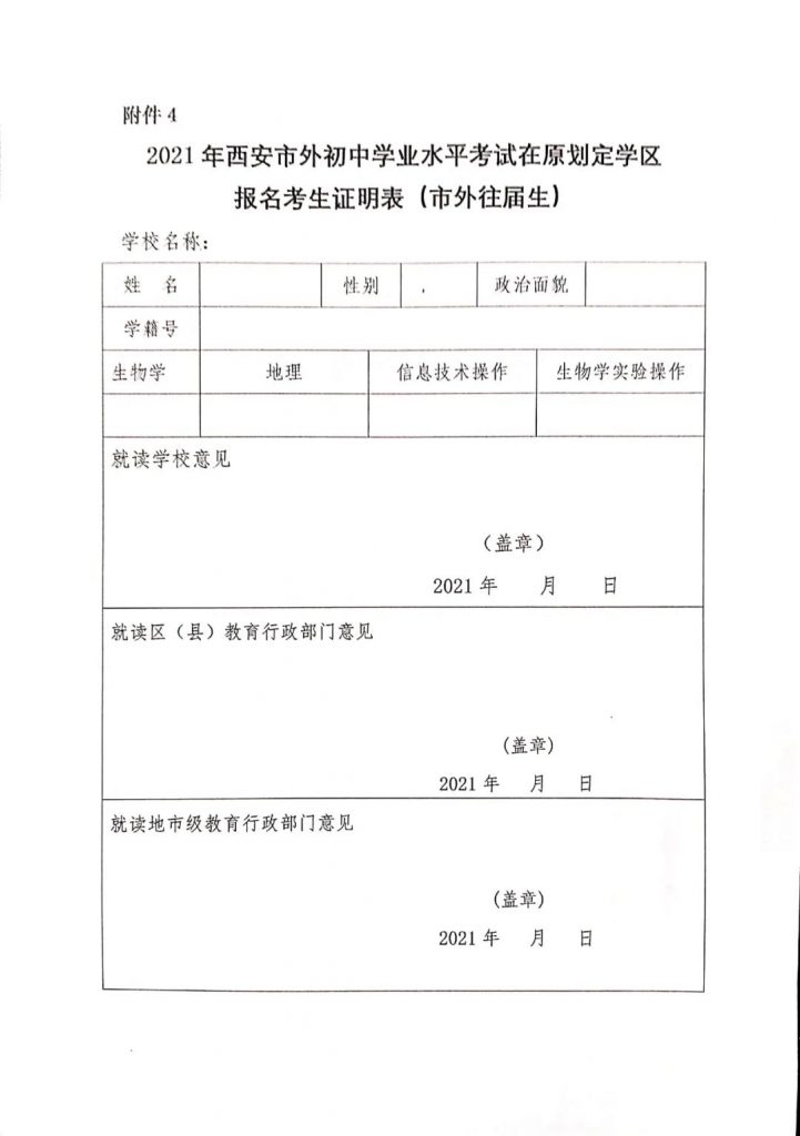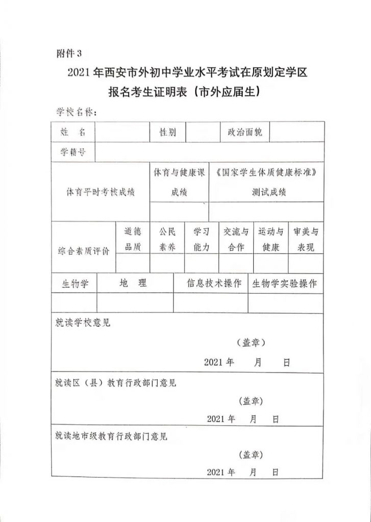 (3)在外省市就读的我区户籍初中应届生,持户口本(卡)、身份证、《2021年西安市外初中学业水平考试在原划定学区报名考生证明表》(见附件3)(生物学和地理,信息技术上机操作和生物学实验操作,凡不能提供以等级呈现的成绩证明,建议在西安市重新报名考试)到区教育考试中心进行资格审查,合格后方可办理报名手续;