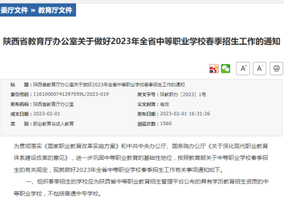 陕西省教育厅办公室关于做好2023年全省中等职业学校春季招生工作的通知 为贯彻落实《国家职业教育改革实施方案》和中共中央办公厅、国务院办公厅《关于深化现代职业教育体系建设改革的意见…