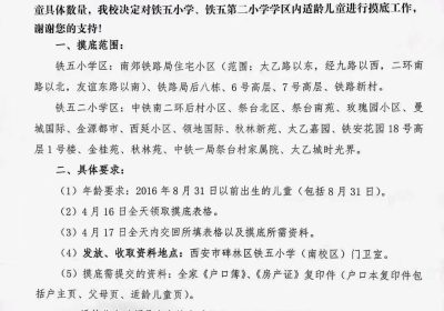 各位家长: 您好,根据上级工作安排,为了做好一年级新生入学工作,了解学区内适龄儿童具体数量,我校决定对铁五小学、铁五第二小学学区内适龄儿童进行摸底工作,谢谢您的支持! 一、摸底范围…