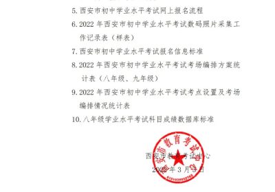 西安市教育局最新文件,公布了2022年八九年级学业水平考试报名和资格审核的时间: 九年级集中资格审查时间:3月8日至3月10日 九年级网上报名时间:3月11日8:00至3月15日1…