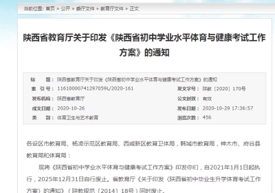 陕西省教育厅关于10月29日印发《陕西省初中学业水平体育与健康考试工作方案》的通知,自2021 年1 月1 日起执行,2025 年12 月31 日自行废止。 1、考试项目:增加游泳…